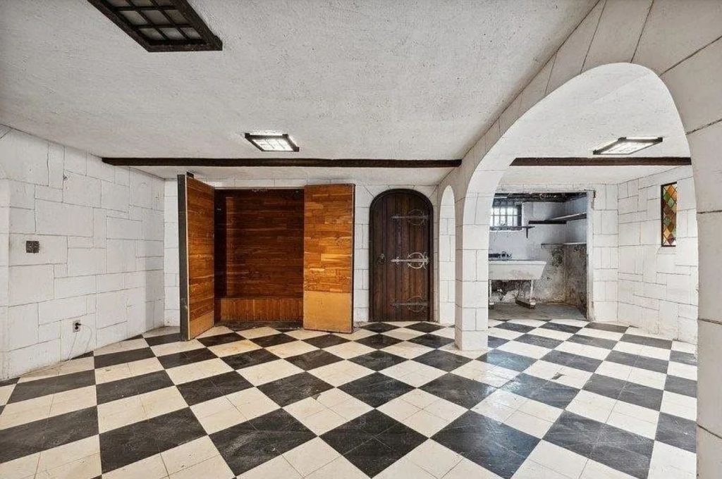 This basement exudes character with its blend of classic and rustic elements. The striking black-and-white checkered tile flooring adds a bold, timeless appeal, contrasting beautifully with the textured white walls that mimic stone. Dark wooden beams accent the low ceiling, lending a cozy, intimate feel. An arched doorway leads to a secondary space, while a small stained-glass window introduces a subtle pop of color. The rich wood-paneled alcove and ornate wooden door with wrought-iron details enhance the room’s old-world charm. With its unique architectural features, this space has endless potential for a stylish, one-of-a-kind transformation.