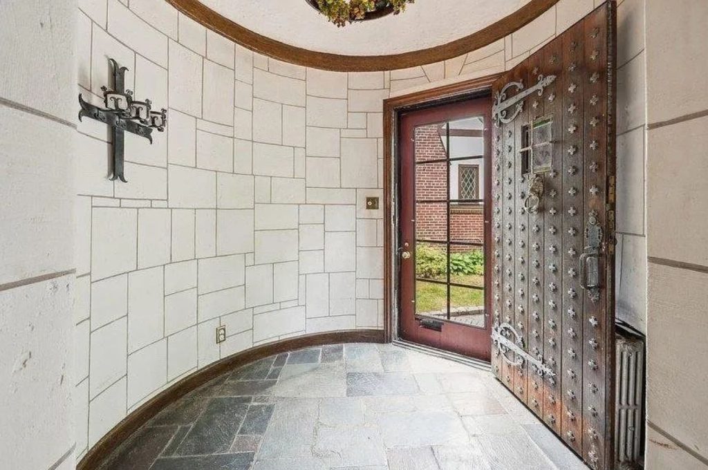 Step through the arched entryway and into a stunning medieval-style foyer that immediately captivates with its unique blend of historic elegance and modern warmth. The solid wood door, adorned with intricate iron studs and hardware, sets a regal tone, evoking the grandeur of a European castle. The curved walls, lined with stone-like textured paneling, create a sense of timeless sophistication, while the slate flooring adds depth and durability. A charming wrought-iron cross sconce enhances the character of this space, making it the perfect first impression for a home that exudes class, craftsmanship, and undeniable architectural beauty.
