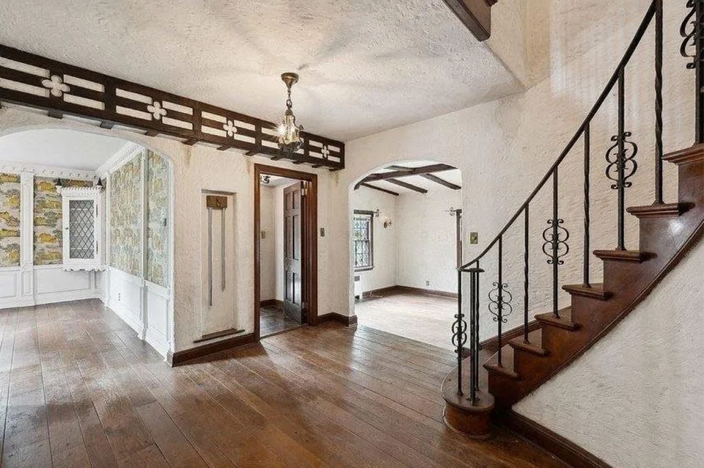 This stunning lobby makes a lasting first impression with its old-world charm and character. The rich wood flooring extends throughout, complemented by textured plaster walls and intricate wrought-iron stair railings that add a touch of elegance. A decorative beam with quatrefoil detailing draws the eye upward, while the arched doorway leads seamlessly into the adjacent spaces. Vintage-inspired lighting and built-in cabinetry showcase the home’s timeless craftsmanship, while the warm, earthy tones create a welcoming atmosphere. A gracefully curved iron-railed staircase adding a dramatic architectural touch, blends history with sophistication, making this foyer both grand and inviting.