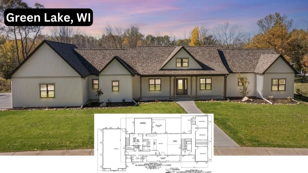 This stunning modern farmhouse in Green Lake, WI, offers 2,592 sq. ft. of thoughtfully designed living space on a spacious 0.93-acre lot. Priced at $795,000, this 4-bedroom, 3-bath home features an open-concept layout with a bright and airy living area. The gourmet kitchen boasts matching quartz countertops and cabinets, a pantry, and a large island. The primary suite includes dual walk-in closets and a luxurious walk-through shower. A 3-car garage, dedicated laundry room, and elegant finishes complete this exceptional home.