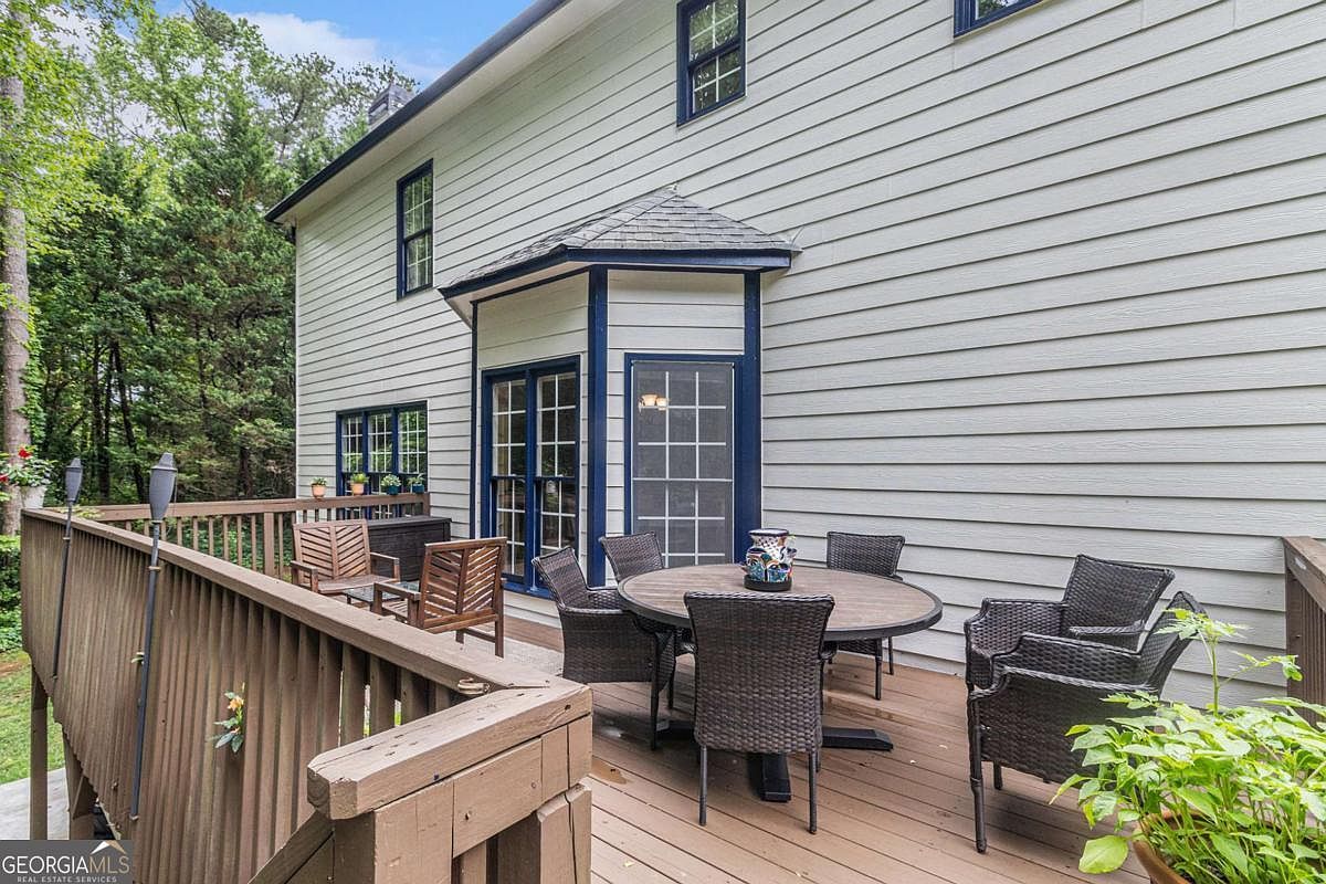 This inviting deck offers an outdoor living space ideal for entertaining or relaxing. The area features a wooden floor with a warm, natural tone complemented by a railing of the same material. A round dining table surrounded by six woven rattan chairs creates a cozy spot for meals or gatherings. Adjacent to this is a smaller seating nook with two wooden armchairs and a small bench. The home’s exterior is clad in white siding with navy-blue trim around windows and doors, adding a crisp, classic contrast. Surrounded by lush green trees, it blends seamlessly with nature.