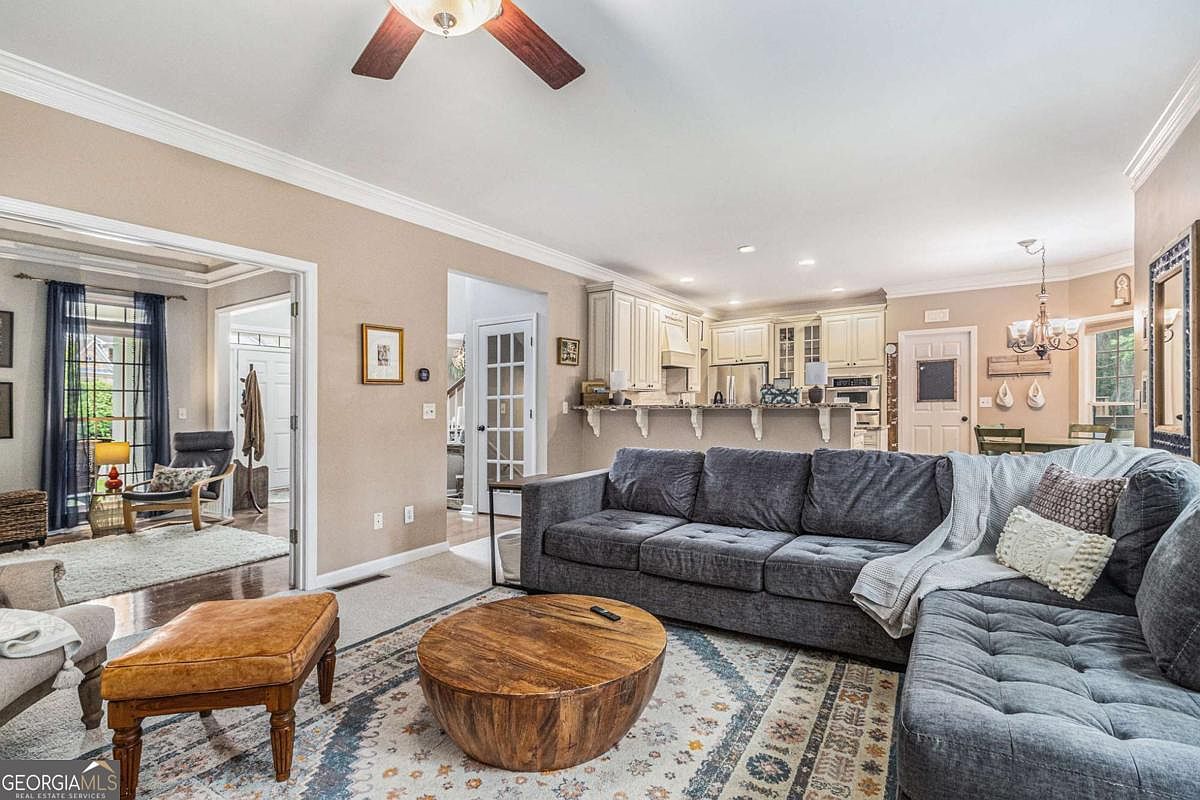 This open-concept living space features a spacious sectional sofa in a soft gray fabric, paired with a round wooden coffee table and a warm leather ottoman, creating a cozy and inviting seating area. The area rug under the furniture adds a layer of charm with its subtle patterns and neutral tones. The room seamlessly flows into a kitchen painted in creamy white cabinetry, accented by a breakfast bar with corbels. Natural light fills the room through large windows, enhancing the earthy beige walls and white crown molding that add architectural interest. A ceiling fan with wooden blades complements the warm, homey atmosphere.