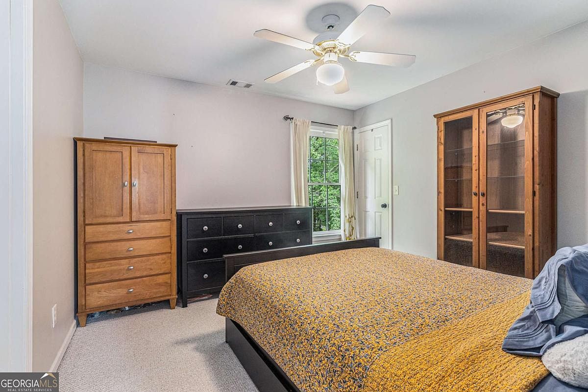 This bedroom features a calming, neutral palette with soft gray walls paired with light carpeting, creating a serene retreat. A black bed frame anchors the space, dressed in a mustard yellow floral-patterned bedspread that adds a warm pop of color. To the left, a classic wooden armoire and a long black dresser offer ample storage and contrast the lighter tones. A glass-front wooden cabinet stands on the right, highlighting functional yet stylish storage. Natural light filters through a window dressed with simple white curtains, while a white ceiling fan provides both illumination and airflow, complementing the room’s understated, practical design.