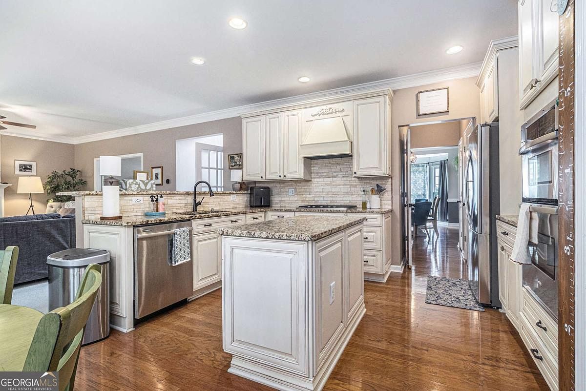 This kitchen features a bright and spacious layout with a central island that offers additional preparation space and storage. The cabinetry is classic off-white with detailed paneling, complemented by a granite countertop in warm tones that harmonize with the wooden flooring. A stainless steel dishwasher and double ovens add modern convenience, while the beige tile backsplash with a subtle texture provides visual interest behind the cooking area. The adjacent living space and natural light flowing through the open doorways create an inviting and open atmosphere, elevated by crown molding and recessed lighting.