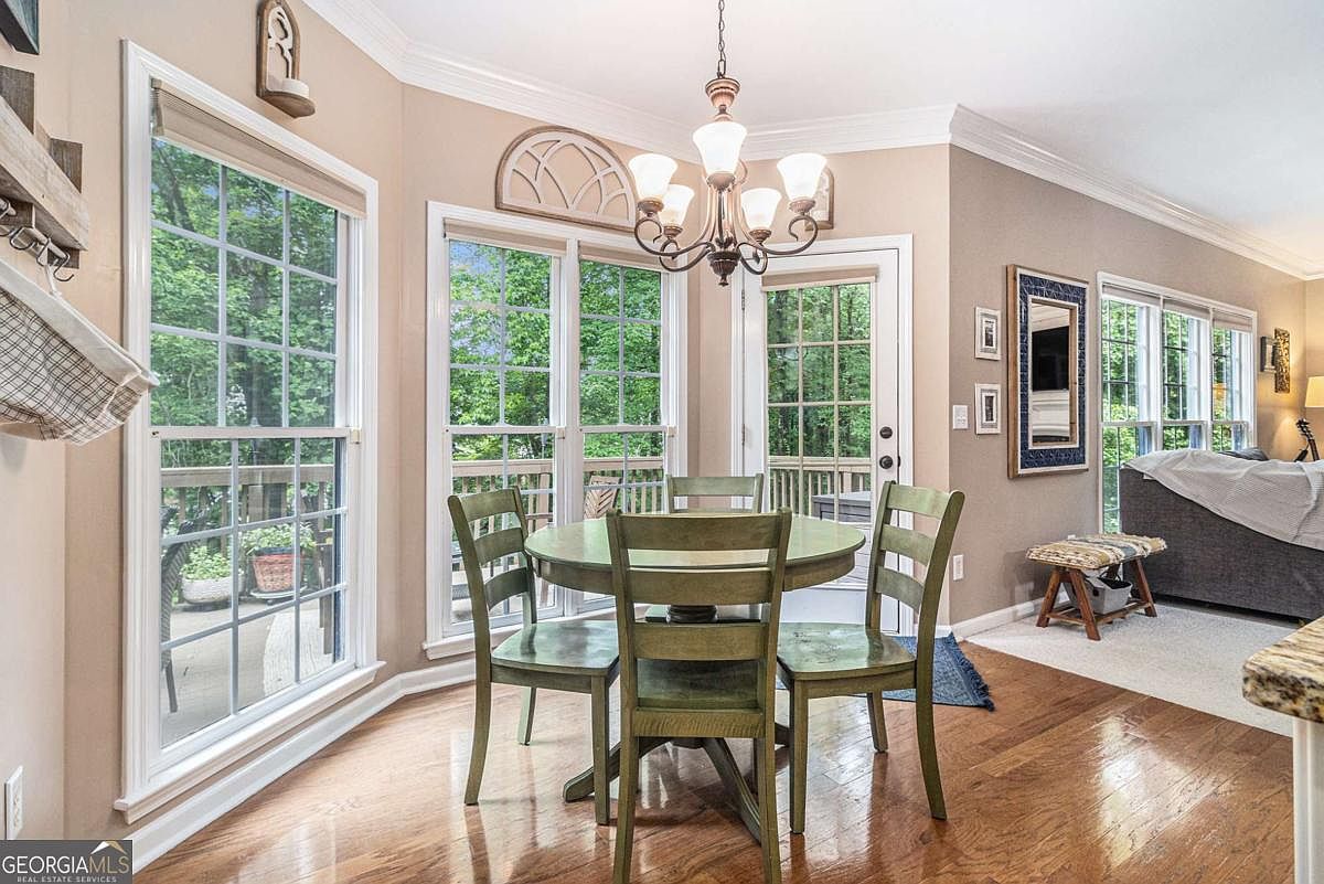 This inviting dining nook is anchored by a round wooden table surrounded by four matching chairs in a muted olive green finish, creating a cozy yet functional space. The area is bathed in natural light streaming through large, multi-pane windows and a glass door leading out to a wooden balcony, bordered by lush greenery. Walls painted in warm beige compliment the rich tone of the hardwood flooring. An elegant bronze chandelier with frosted glass shades hangs overhead, adding a soft ambient glow. Adjacent to the dining space, the living room with neutral upholstery hints at an open-concept, cohesive layout.