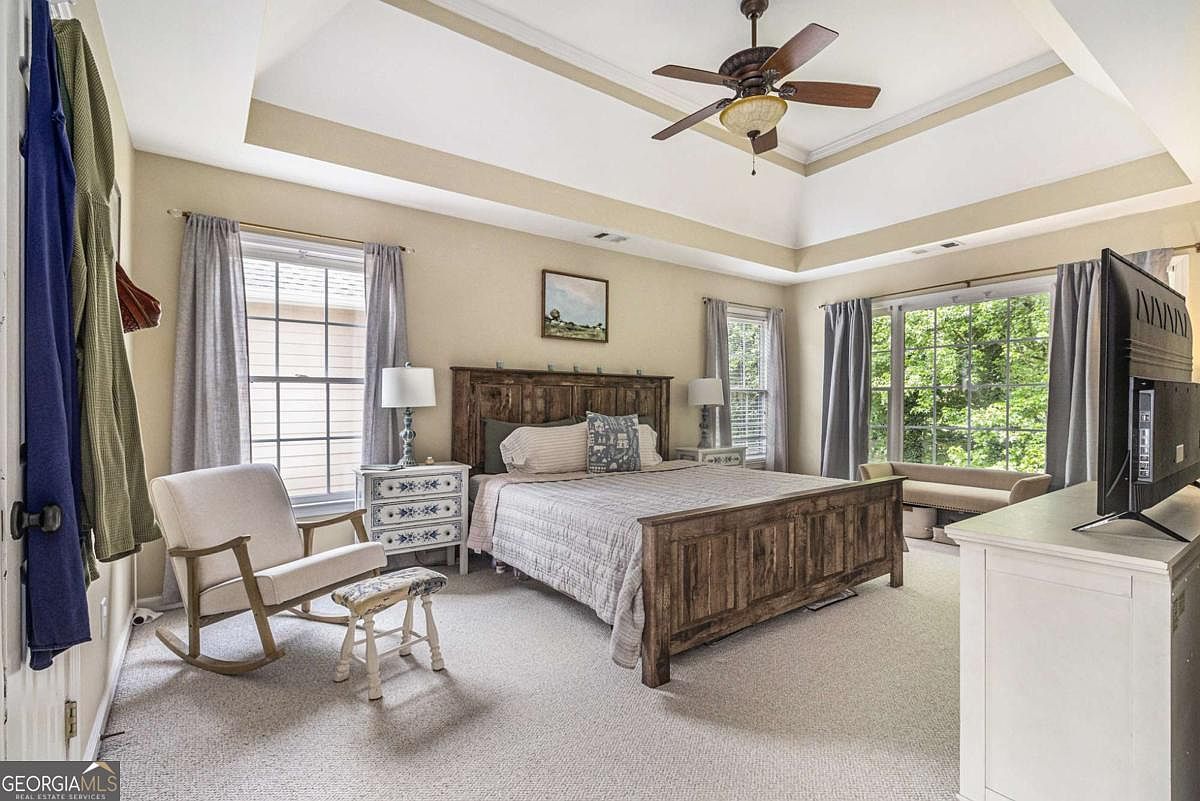 This master bedroom features a spacious layout with neutral beige walls and a coffered ceiling highlighted by a wooden ceiling fan with a central light. Natural light floods the room through multiple windows dressed with soft gray curtains, enhancing the airy feel. The centerpiece is a rustic wooden bed frame paired with a neutral-toned bedspread and accent pillows. Matching white bedside tables with floral drawer details flank the bed, each holding elegant matching lamps. A cozy rocking chair and small footstool sit near one window, while a white dresser topped with a large flat-screen TV faces the bed. A cushioned bench by the large window invites relaxation while offering a scenic view of greenery outside. The light carpeting complements the overall soft and inviting ambiance.