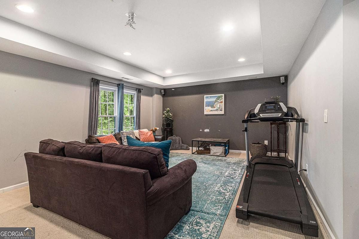 This room combines relaxation and fitness with a modern touch. A large, dark brown sectional sofa anchors the seating area, adorned with colorful accent pillows in coral and teal hues. The walls are painted soft gray with one darker gray accent wall framing a simple coastal-themed artwork. Natural light flows in through two windows dressed with soft gray curtains. Opposite the sofa, a black treadmill occupies a corner, emphasizing a multi-functional layout. The floor is covered with a large patterned blue rug that adds a touch of texture and warmth to the neutral carpet beneath.
