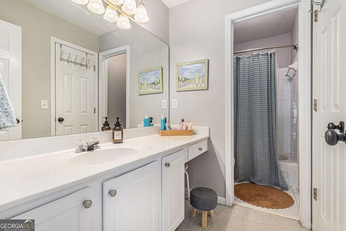 This bathroom features a long white vanity countertop with a built-in sink and silver hardware on the cabinetry below. A large mirror spans the length of the vanity, enhancing brightness and space. The walls are painted a soft neutral gray, complementing the clean white cabinetry and light carpeted floor. Above the vanity, a row of brushed nickel light fixtures provides ample illumination. Two small framed landscape paintings add a subtle decorative touch. Through the open doorway, a tiled shower area with a blue-gray textured shower curtain and a round brown bath mat is visible, completing this simple yet functional design.
