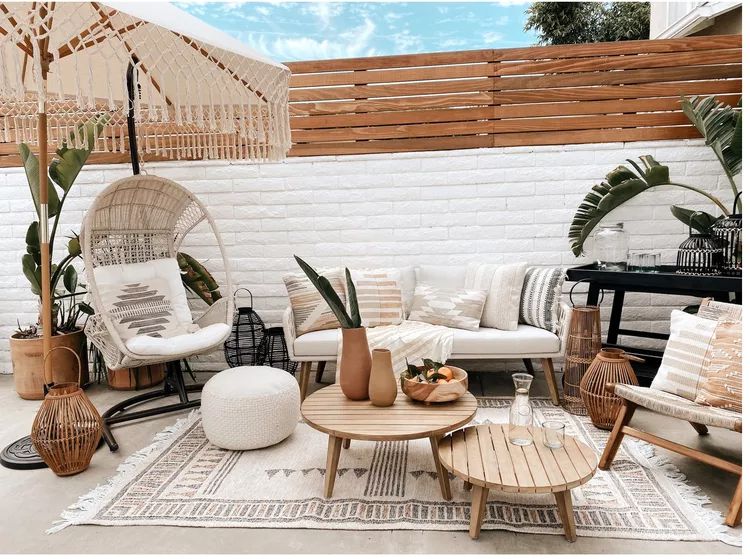 Channel bohemian charm with a mix of natural materials, vibrant patterns, and eclectic decor. Whitewashed brick walls, rattan furniture, and macramé accents set the stage for a relaxed, free-spirited outdoor living room. Incorporate hanging plants, fairy lights, and colorful textiles to complete the laid-back look.