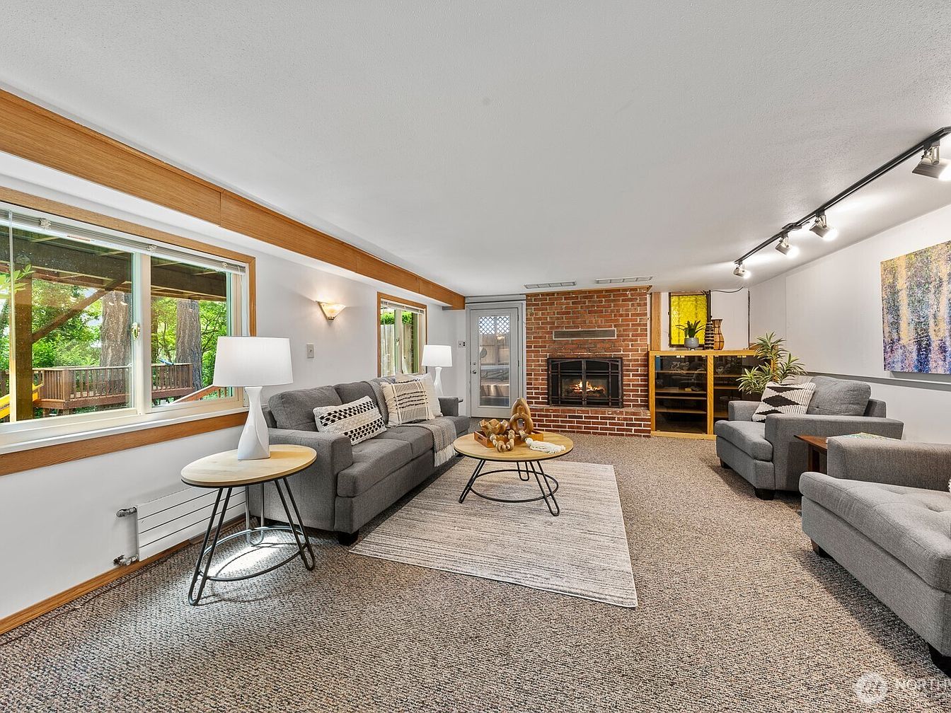 This spacious family room features a warm and inviting design that balances comfort and functionality. The neutral color palette is grounded by soft gray upholstered furniture, including a large sofa and armchairs, complemented by textured throw pillows. Natural light floods the space through large windows with wood trim, offering views of lush greenery outside. A brick fireplace provides a cozy focal point, framed by built-in wood cabinetry housing decor and plants. The carpeted floor and area rug enhance warmth, while modern lighting fixtures, including a track light system and wall sconces, create a well-lit atmosphere perfect for relaxation and gatherings.