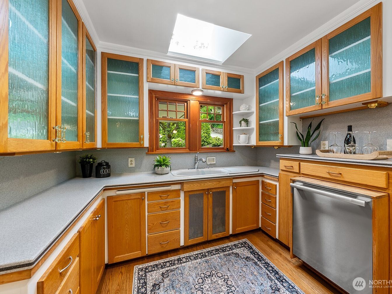 This kitchen corner features a cozy U-shaped layout focused around a central sink positioned under a wood-framed window that offers a view of lush greenery outside. The cabinetry is crafted from warm-toned wood with textured glass panels on the upper cabinets, adding a vintage yet elegant touch. Smooth, light gray countertops complement the wood tones while providing a clean contrast. A skylight overhead brightens the workspace naturally. The floor is hardwood with a patterned area rug, contributing to an inviting and homely atmosphere. Stainless steel appliances and small decorative plants add modernity and freshness.