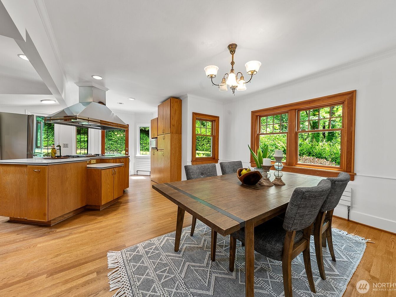This open dining space connects seamlessly with the kitchen, featuring warm wooden flooring and cabinetry that enhance a cozy, natural vibe. The dining table is sturdy with a dark wood finish, accompanied by cushioned grey upholstered chairs, creating a comfortable and inviting setting. Generous windows framed in rich wood allow abundant natural light, highlighting the lush greenery outside. A neutral patterned rug grounds the dining area, adding texture without overwhelming the simplicity. Above, a classic chandelier provides soft ambient lighting, complementing the clean white walls and creating a harmonious balance between traditional and modern elements.