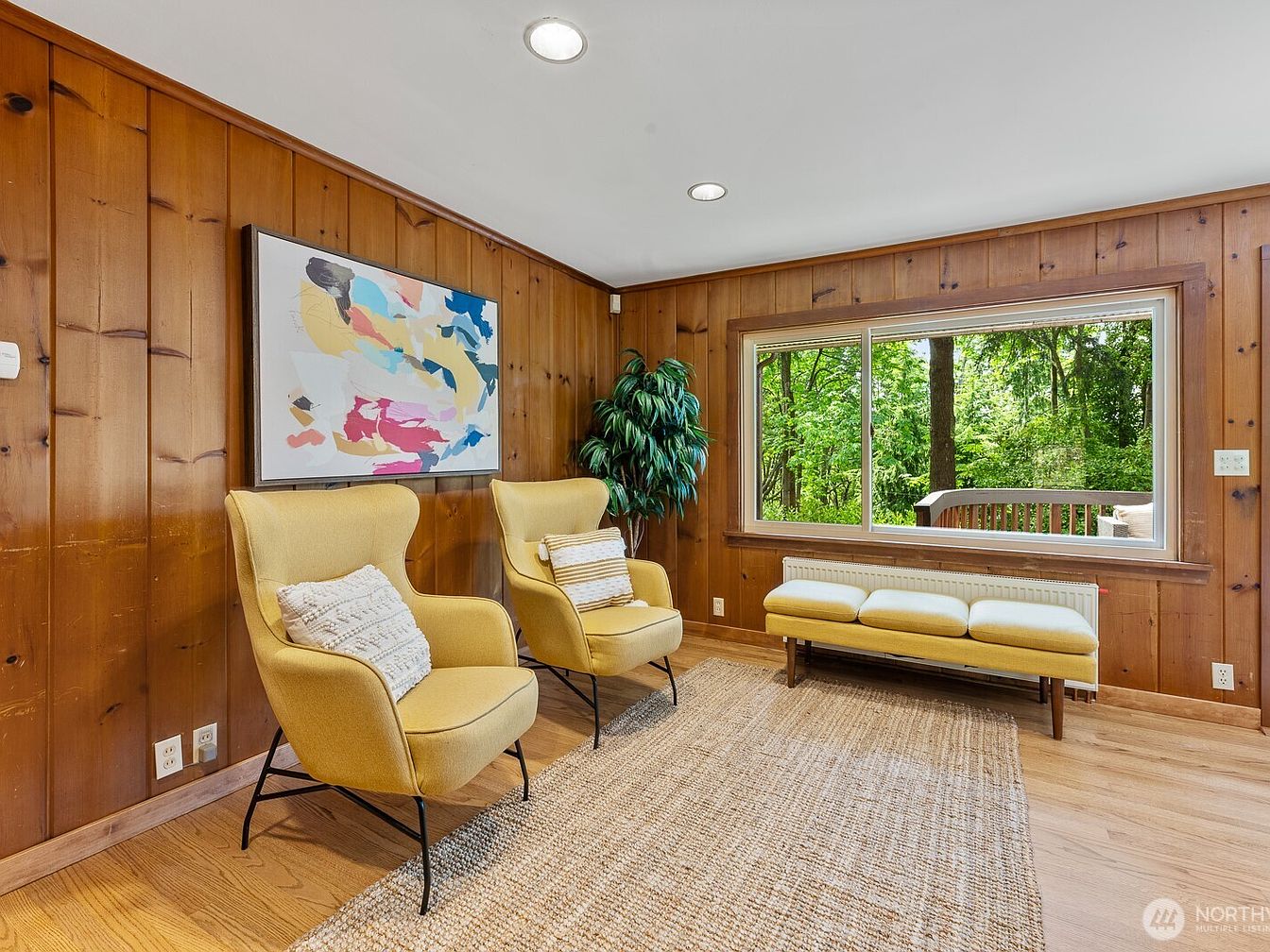 This inviting sitting area features warm wood-paneled walls that bring a rustic, cabin-like charm to the space. The floor is a light, natural hardwood, complemented by a textured woven jute rug that adds softness underfoot. Two mustard-yellow wingback chairs with black metal legs are positioned against the paneled wall, each adorned with a cozy textured throw pillow. A matching long bench with cushions sits beneath a large window, offering a tranquil view of lush greenery outside, inviting natural light in. Above the chairs, contemporary abstract artwork injects pops of pastel colors, balancing the warm earthy tones beautifully.