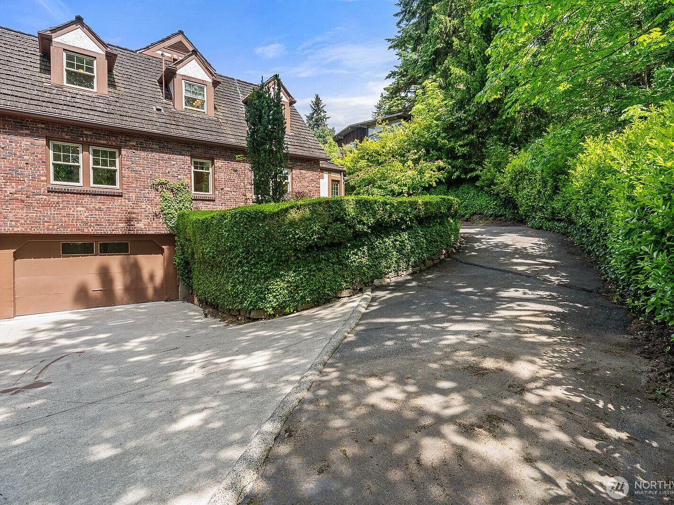 This serene exterior highlights a well-maintained driveway leading up to a spacious two-car garage. The home’s facade features classic red brick with light brown trim, creating a warm and timeless aesthetic. Symmetrical dormer windows on the steeply pitched roof add charming architectural interest, while neatly trimmed hedges border the driveway, contributing to a lush, green atmosphere. Tall trees and dense foliage envelop the scene, offering privacy and a natural backdrop. The paved areas show subtle shadows from surrounding foliage, emphasizing the harmony between house and landscape in this inviting residential setting.