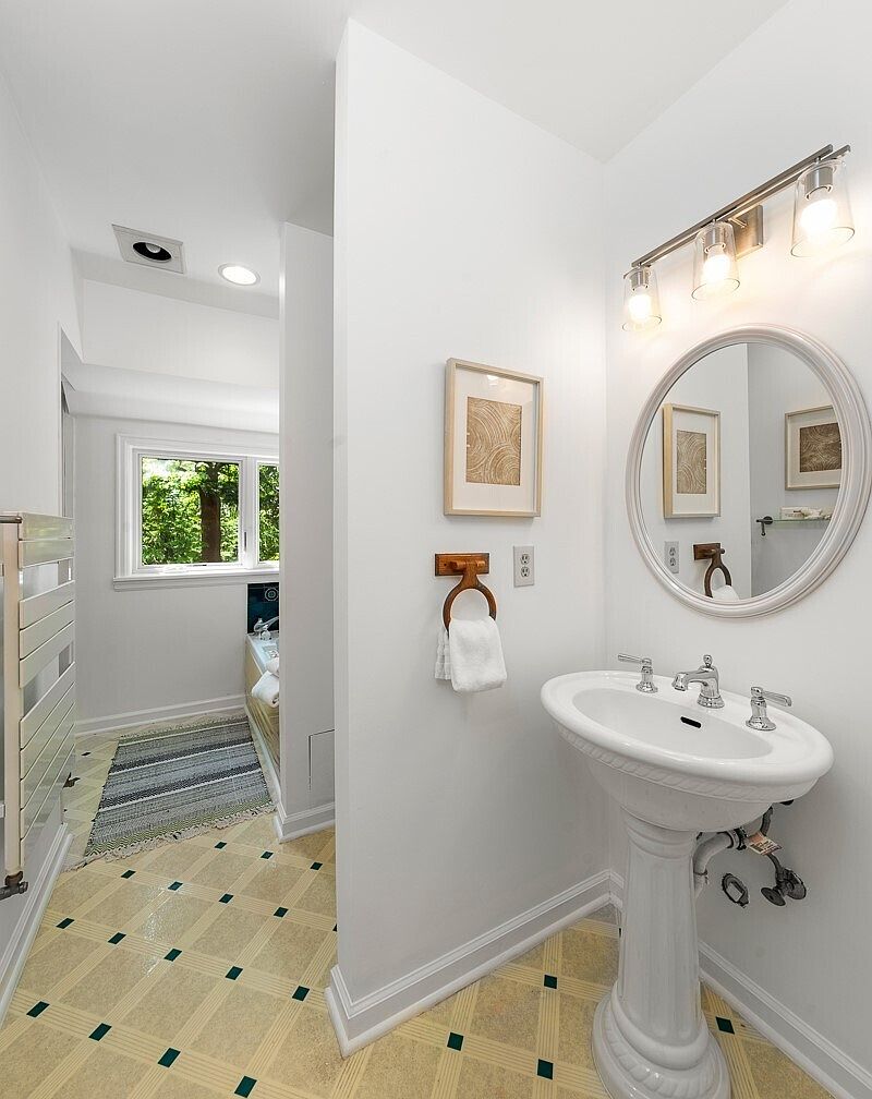 This bathroom corner features a classic white pedestal sink paired with polished chrome fixtures, evoking a clean and timeless aesthetic. Above the sink hangs an oval mirror framed in white, flanked by a brushed nickel three-light fixture with clear glass shades, providing soft, inviting illumination. The walls are crisp white, creating a bright and airy feel, while a simple wood towel ring with a white hand towel adds warmth. Adjacent is a piece of framed, neutral-toned abstract art. The flooring showcases a subtle checkered pattern in beige with small green accents, extending throughout with natural light filtering from a window near a bathtub area visible beyond the partial wall.