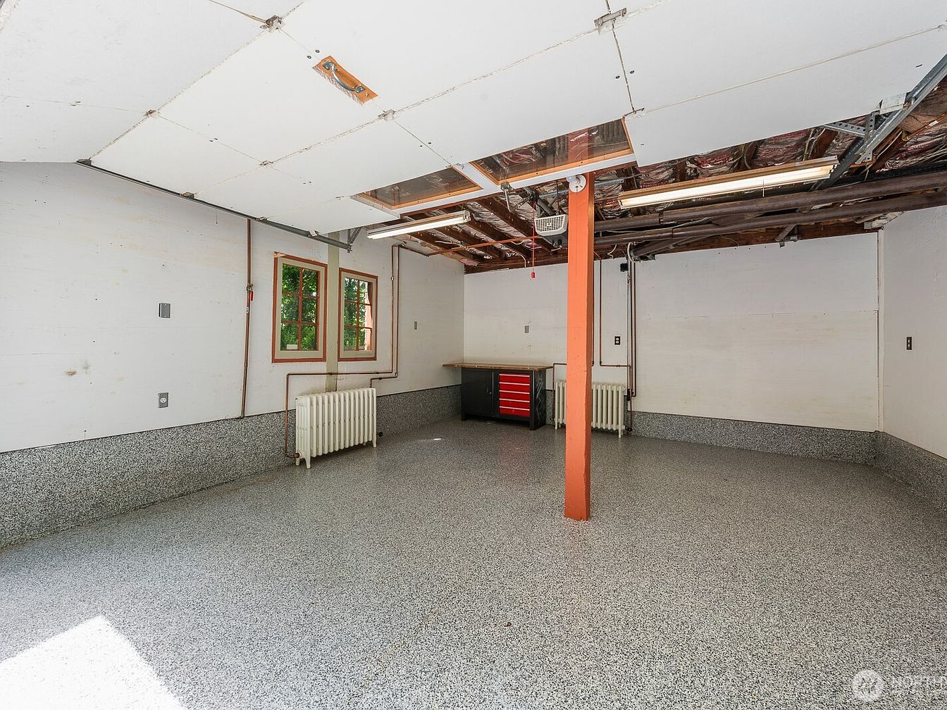 This spacious garage area features a speckled epoxy floor that enhances durability and ease of cleaning. The walls are painted a neutral white with a protective lower half coating, complementing the simple, functional aesthetic. Two small windows framed in natural wood let in subtle daylight, illuminating the space alongside industrial fluorescent lighting overhead. An orange-painted support post adds a pop of color, coordinating with exposed utility pipes lining the walls. The ceiling exposes insulation and structural elements, giving the garage an unfinished, utilitarian look. A black and red workbench tucked in the corner suggests a hobby or repair zone.