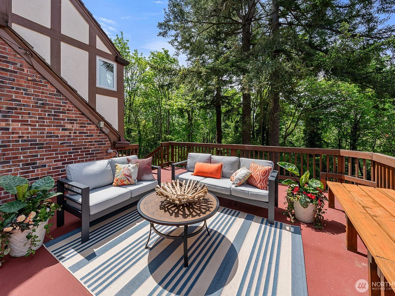 This outdoor deck area offers a serene space for relaxation and socializing, surrounded by lush green trees providing privacy and natural beauty. The deck floor is finished in a warm reddish tone, complementing the classic brick and beige stucco house exterior with brown timber framing. Two modern gray cushioned sofas sit opposite each other on a large, striped blue-and-white outdoor rug. Decorative throw pillows in orange and patterned designs add vibrant accent colors. A round coffee table with a natural wood centerpiece anchors the seating area. Large potted plants at the corners bring additional greenery, enhancing the inviting atmosphere.