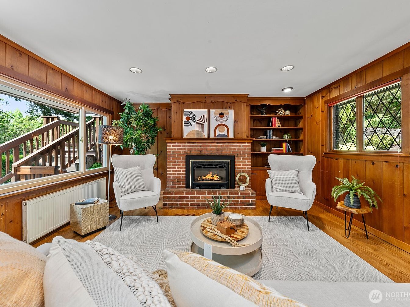 This inviting lounge area centers around a classic red brick fireplace with a built-in wooden mantel and surrounding shelves that display a curated mix of books and decorative items. The warm wood paneling on walls and ceiling adds rustic charm, complementing the honey-toned hardwood floor. Two cozy, modern wingback armchairs in light beige sit symmetrically around a round, cream-colored coffee table layered on a textured neutral area rug. Large windows with wooden frames and diamond lattice details allow natural light to brighten the room, showcasing the balance of traditional and contemporary design elements amidst earthy tones and lush greenery accents.