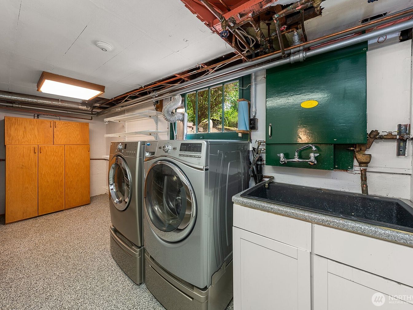 This functional laundry area features a pair of modern, front-loading stainless steel washer and dryer units with chrome accents. Alongside, a spacious utility sink with a speckled countertop and white cabinetry provides practical cleaning space. Above the sink, a green metal panel conceals plumbing fixtures, adding a vintage industrial touch. The room includes ample storage with tall wooden cabinets in a warm oak finish and metal shelving along the wall. The speckled gray flooring ties the space together, while exposed pipes and a modest window offer a utilitarian yet bright ambiance typical of a basement or dedicated laundry room.