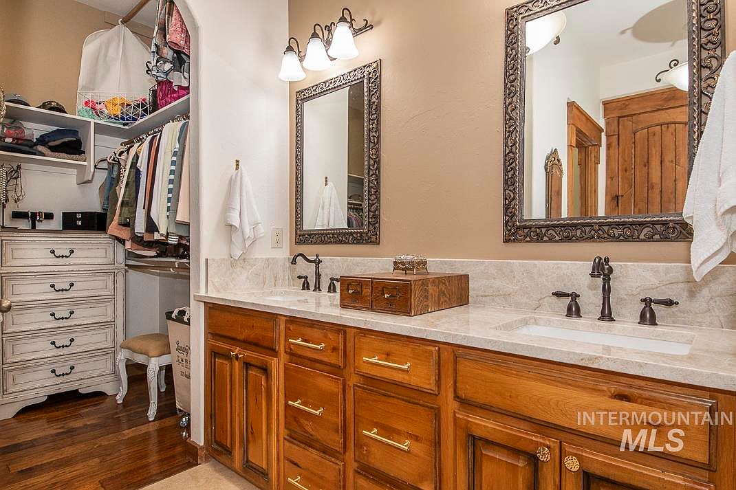 This bathroom features a warm, inviting design with a double vanity made of rich, natural wood cabinetry topped by a light marble countertop. The faucets and fixtures are finished in antique bronze, complementing the ornate framed mirrors above each sink. The wall color blends soft beige and cream tones, adding to the cozy atmosphere. To the left, a charming walk-in closet with a white distressed dresser provides storage and organization. The wooden flooring ties the spaces together, lending an elegant rustic touch. Overall, the area balances functionality with traditional aesthetic details.