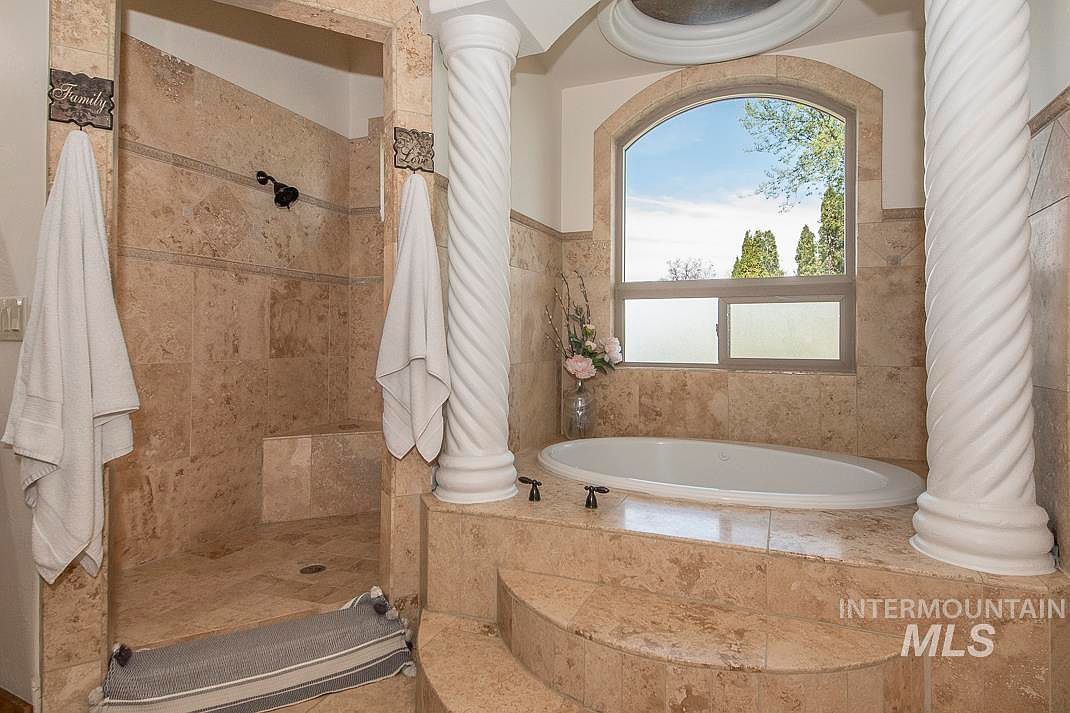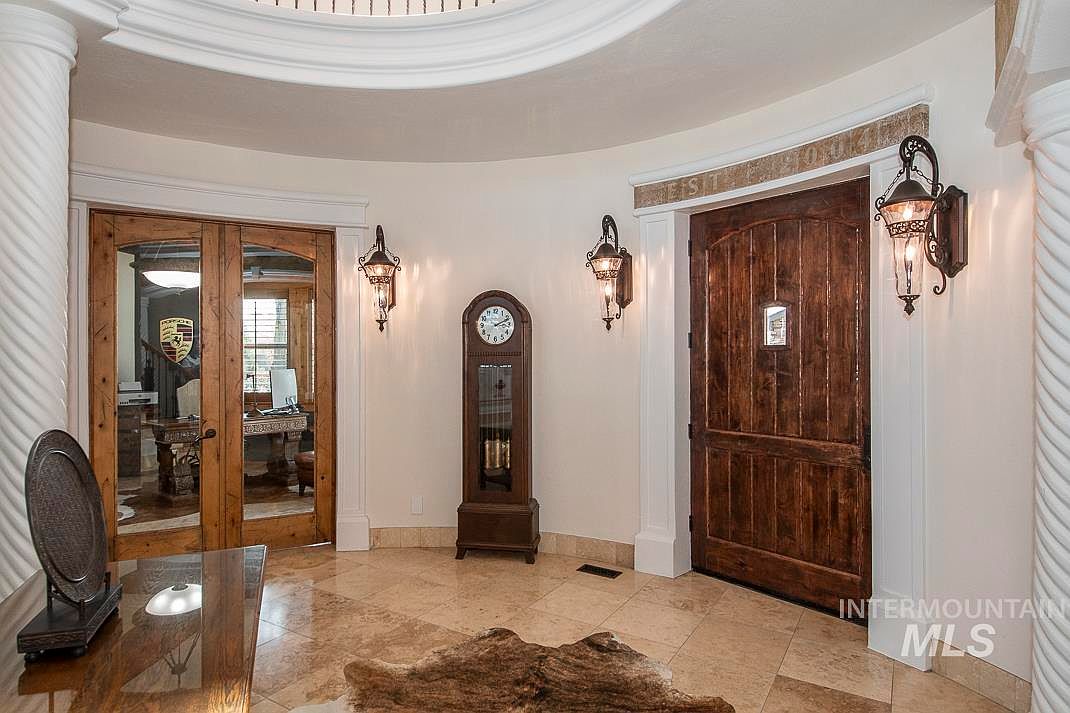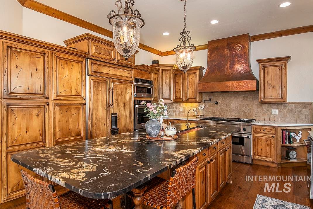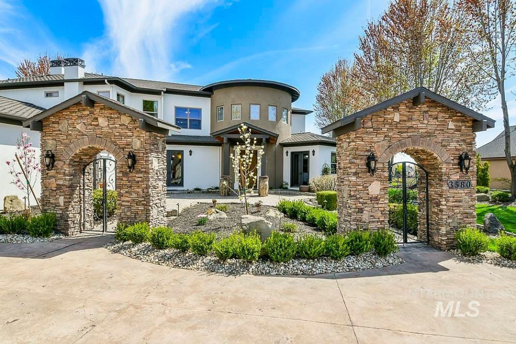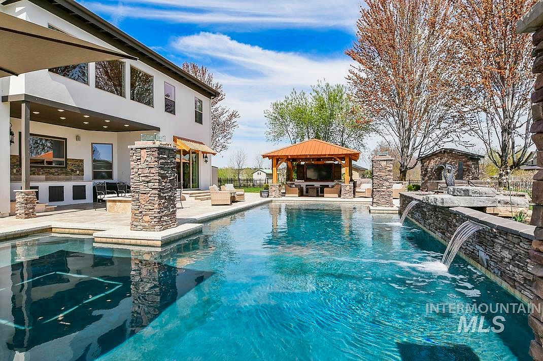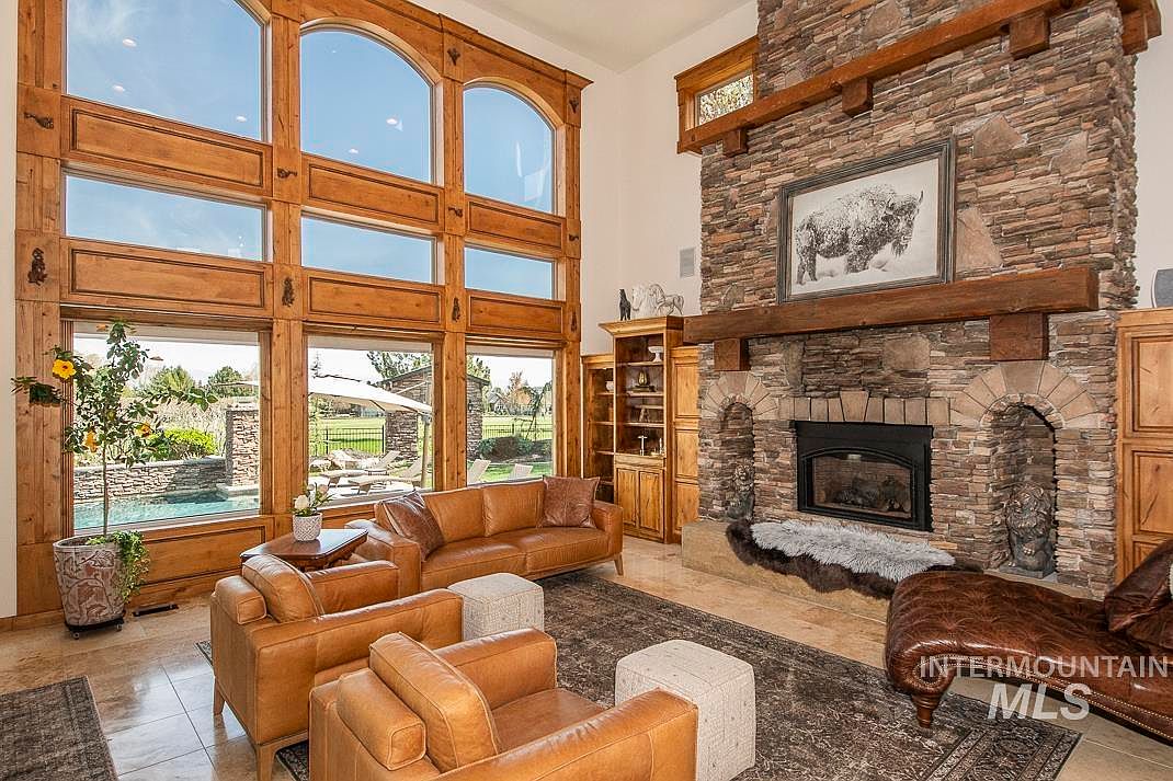 This stunning custom home showcases exquisite Tuscan architectural style, beautifully blending rustic stone elements with a modern layout. Located in Star, Idaho, this unique property features a detached 450 sq ft in-law cottage and is set on a lush 0.73-acre plot that backs up to the scenic River Birch Golf Course, offering breathtaking views of the Boise mountains. Originally built prior to recent renovations, the home underwent a comprehensive remodel in 2022, with numerous additional updates completed in 2024. The residence boasts an outstanding floor plan that includes a huge great room with soaring ceilings, a dramatic 28-foot stone fireplace, and a wet bar perfect for entertaining. The gourmet kitchen is equipped with high-end appliances such as a Thermador 6 burner gas range with pot filler, dual sinks, two dishwashers, and a Sub-Zero refrigerator. Additional indoor amenities include a large bonus room, a separate theater room, a spacious office with an exterior door, and a stunning primary suite featuring a jetted tub, walk-in tiled shower with two showerheads, and a second gas fireplace. Interior finishes are highlighted by beautiful travertine and hardwood flooring. The oversized, extra-deep 3-car garage is also outfitted with 220 volts and a deep sink. Outside, the property features an incredible in-ground saltwater pool with waterfalls and LED lighting, perfect for relaxation and entertaining. The listing price for this exceptional property is $1,875,000.