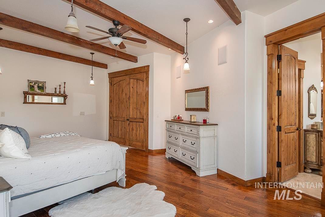 This serene bedroom features warm wood tones contrasted with crisp white walls, creating a cozy yet airy ambiance. The space is anchored by a sturdy wooden bed frame with soft white bedding adorned with subtle blue accents, complementing the cool-toned decor. Exposed wooden beams on the ceiling and a matching ceiling fan enhance the rustic charm. Rich hardwood flooring adds depth, while a soft white faux fur rug offers a plush touch. Wooden framed double closet doors and a dresser with a vintage mirror introduce character and functionality. Pendant lights provide soft illumination, balancing modernity and tradition.