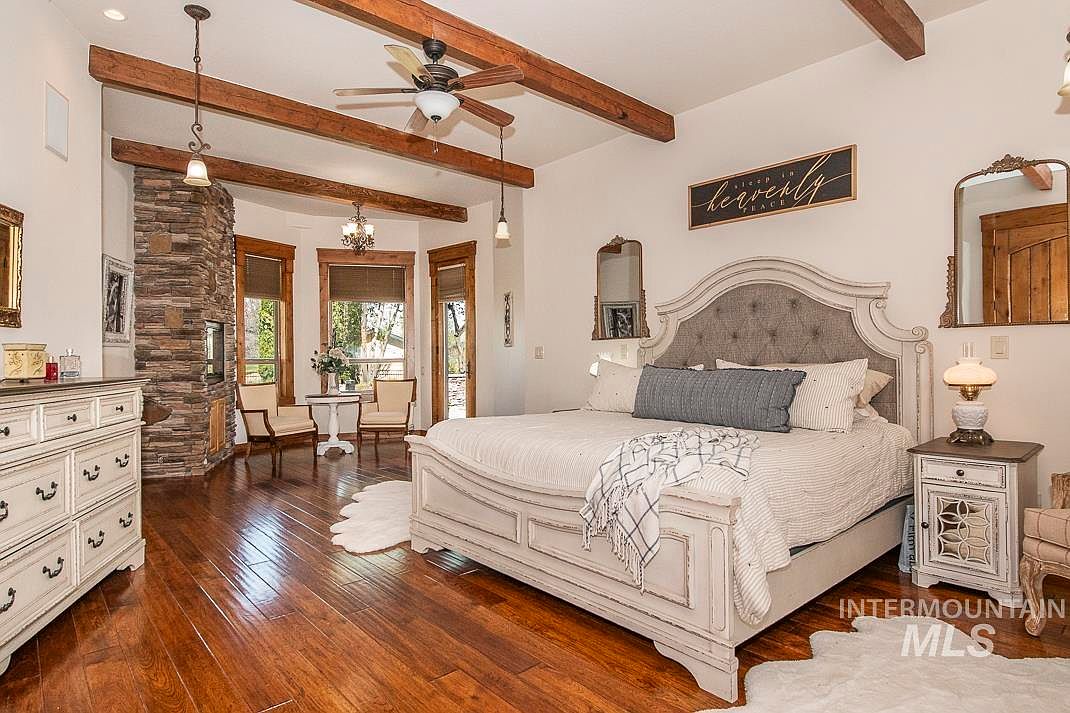 This spacious bedroom features exposed wooden ceiling beams that add rustic charm and warmth to the airy space. The richly stained hardwood floors complement the white walls and distressed white furniture, creating a cozy yet elegant atmosphere. A tufted headboard anchors the classic bed dressed in neutral linens, flanked by matching nightstands with vintage-style lamps. Opposite the bed, a large dresser provides storage while a stone-clad fireplace with built-in shelving adds texture and character. The corner seating nook by the windows includes two upholstered chairs and a round table, perfect for morning coffee and enjoying natural light filtering through woven shades.