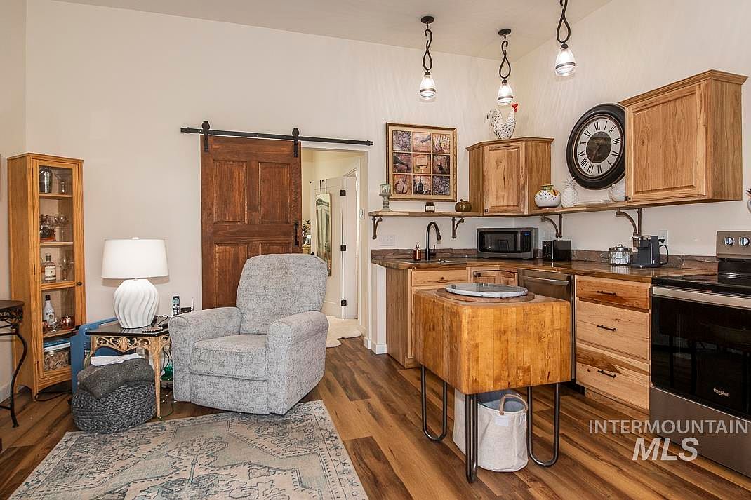 This warm kitchen area features natural wood cabinetry paired with dark granite countertops, creating a harmonious rustic yet functional space. A compact wooden island with hairpin legs sits centrally, adding charm and practicality. The flooring is rich, wood-toned laminate that complements the cabinetry and leads seamlessly to an inviting gray upholstered armchair positioned on a subtly patterned area rug. Soft overhead pendant lights and a large wall clock add both ambiance and style. A barn-style sliding door in dark wood adds a farmhouse touch, blending both comfort and classic design elements in this cozy corner.