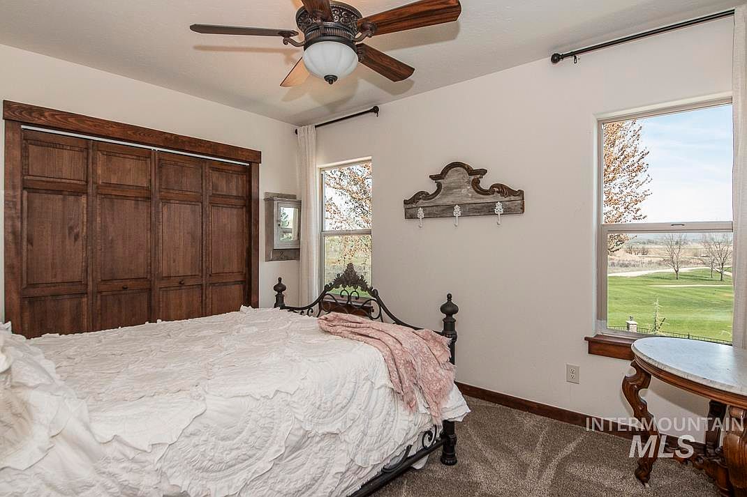 This serene bedroom features a classic wrought-iron bed frame topped with a textured white bedspread and a soft pink throw, adding subtle warmth. Rich dark wood accents are present in the closet sliding doors, window trim, and an ornate small round side table, complementing the neutral beige carpet and crisp off-white walls. Two windows provide ample natural light and a stunning view of lush green lawns and distant trees. A decorative wooden coat rack with vintage hooks and a ceiling fan with wooden blades enhance the cozy, rustic charm of the space. The layout maximizes views while maintaining an inviting atmosphere.