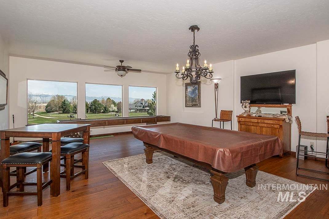 This spacious game room features a rich wood floor that complements the traditional wooden pool table covered with a brown leather case, centered on an intricately patterned area rug. Large windows line one wall, offering serene views of lush greenery and distant mountains, bathing the space in natural light. A dark wrought iron chandelier hangs above the pool table, adding an elegant, vintage touch. The room also includes a wooden cabinet with a large flat-screen TV mounted above it, several wooden chairs, and a small high table with stools ideal for casual seating. Neutral walls provide a calm backdrop, enhancing the warm, inviting atmosphere.
