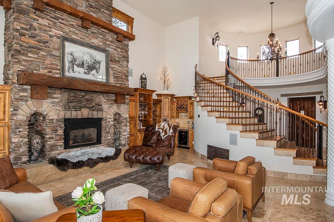 This spacious living room features a dramatic two-story stone fireplace with rustic wooden mantel beams, creating a warm and inviting focal point. The seating area includes rich tan leather armchairs and a dark tufted chaise lounge, arranged on a textured area rug that adds depth and comfort. Neutral-toned stone tile flooring punctuates the space, complementing the natural wood cabinetry and built-in wine storage by the fireplace. A curved staircase with wrought iron balusters and polished wood handrails gracefully ascends to the second-floor balcony, where elegant chandeliers hang above, enhancing the room’s classic yet cozy ambiance.