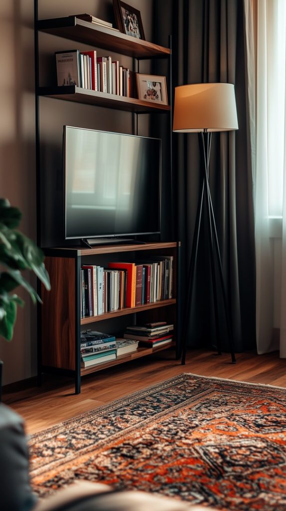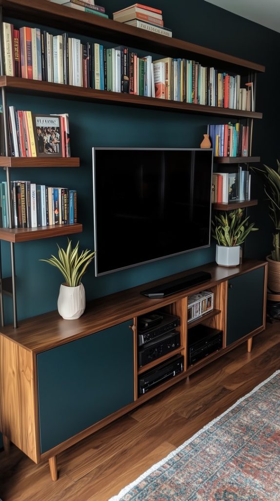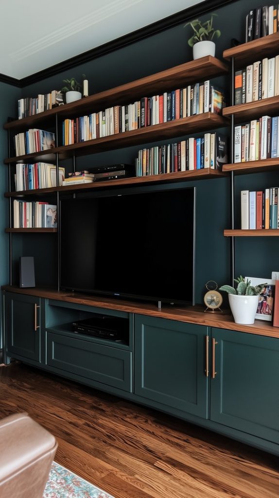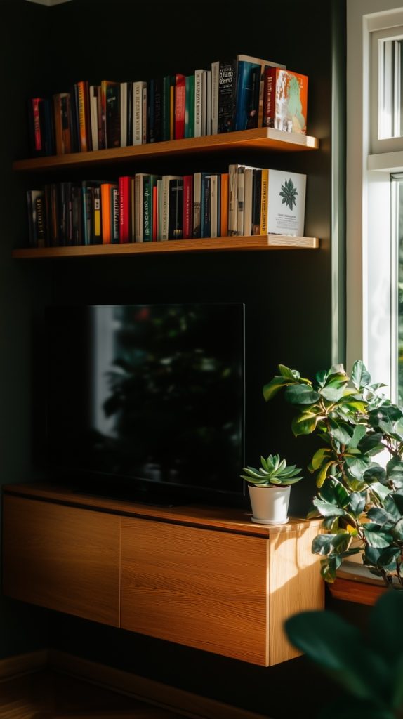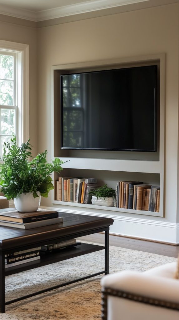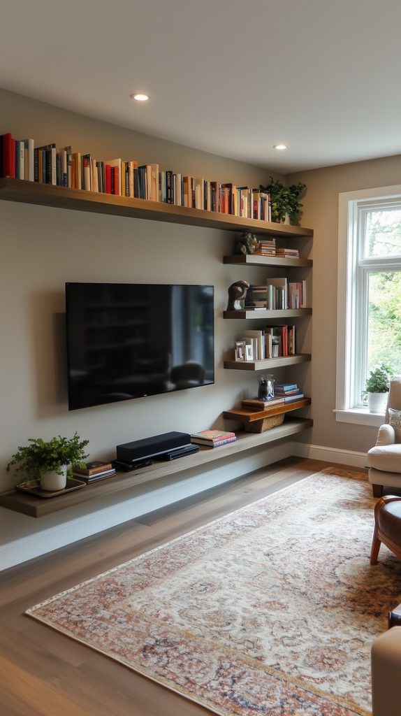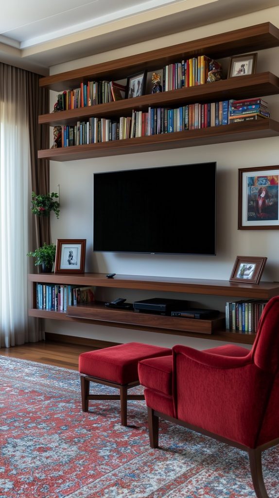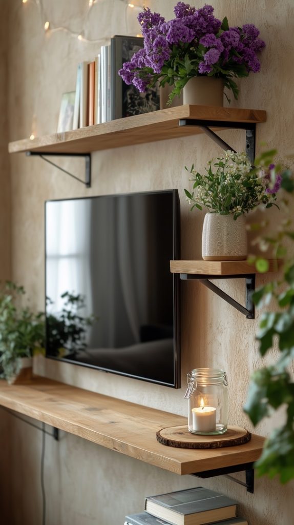 Embrace a modern, clean look with these sleek floating shelves framing the TV. The dark wood adds a touch of elegance while offering space for books and small decor items. This minimalist approach keeps the room uncluttered and stylish, allowing the TV to naturally blend into the design without overwhelming the space.