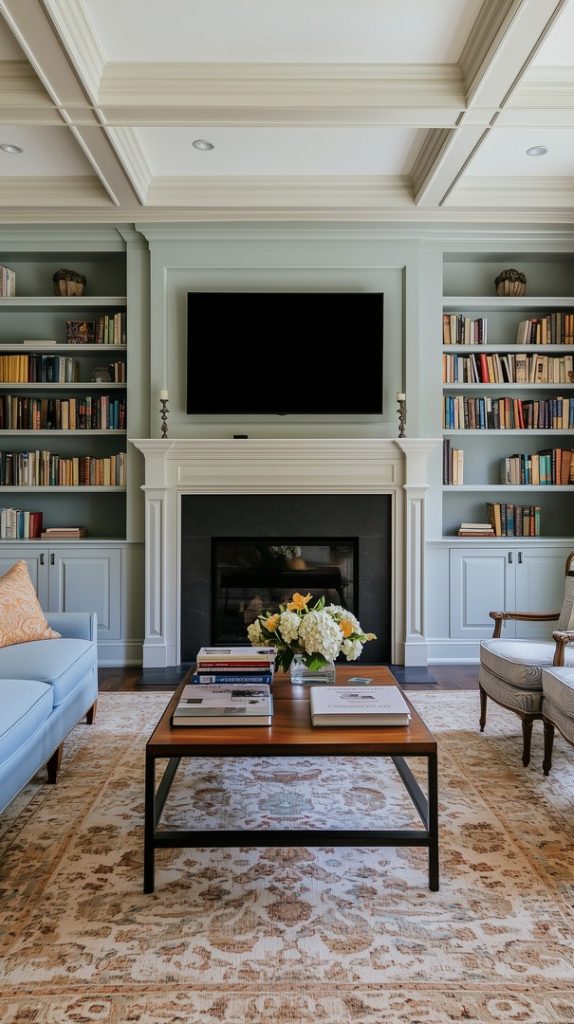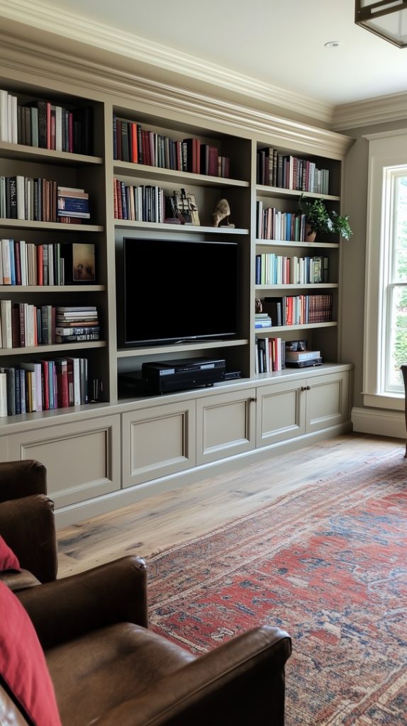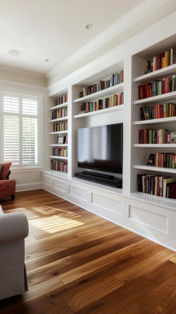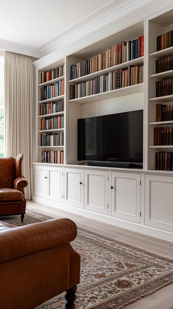 This classic design features a white built-in bookshelf surrounding the TV, creating a refined, traditional look. The shelving offers plenty of room for books and decor, while the TV blends effortlessly into the overall design. The clean lines and neutral tones make this a timeless choice for any living room.