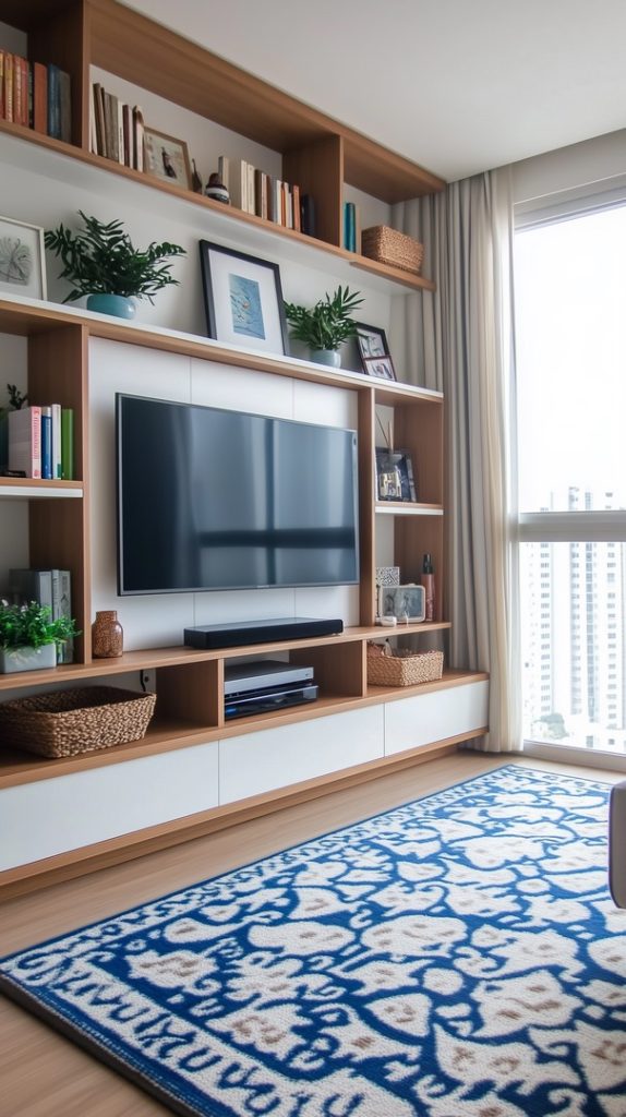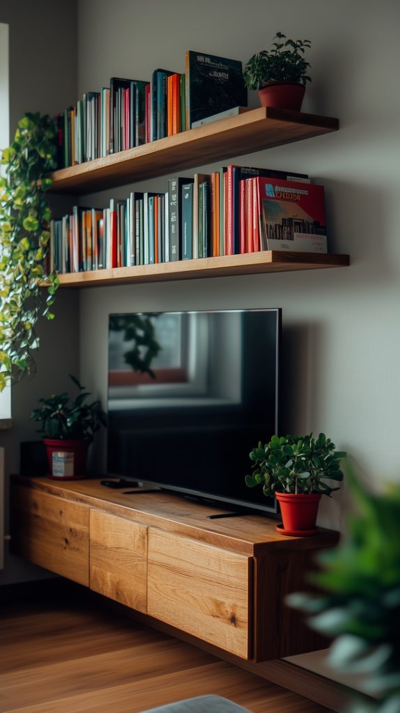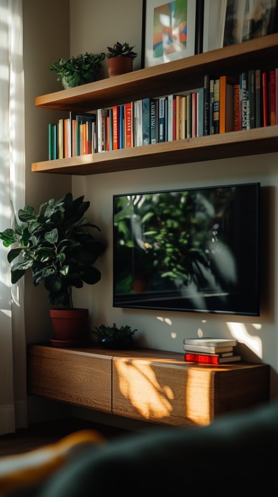 This compact design is ideal for smaller spaces, with a combination of floating shelves and a mounted TV. The lower shelves provide storage for books, plants, and decorative items, while the minimalist design keeps the area uncluttered. The wooden accents and greenery bring warmth and life to the room, making it both functional and aesthetically pleasing.