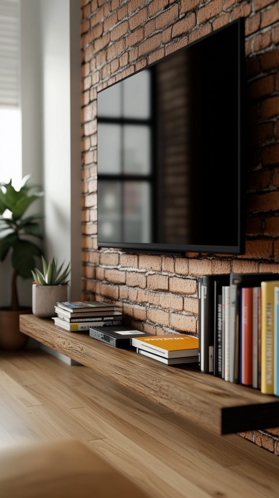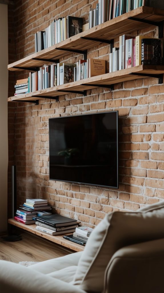 For an industrial-chic vibe, this TV wall features exposed brick paired with rustic wooden floating shelves. The minimalist design keeps the space uncluttered while still providing room for books and decor. The natural materials complement the earthy tones of the room, making it a cozy yet stylish entertainment center.
