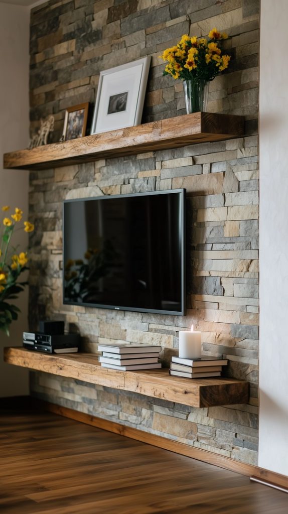 This rustic TV wall features floating wooden shelves that bring warmth and texture to the room. The combination of exposed stone and natural wood provides a cozy, earthy vibe. The shelves are perfect for displaying books, plants, and decorative pieces, making the TV a focal point while seamlessly blending into the room’s rustic aesthetic.