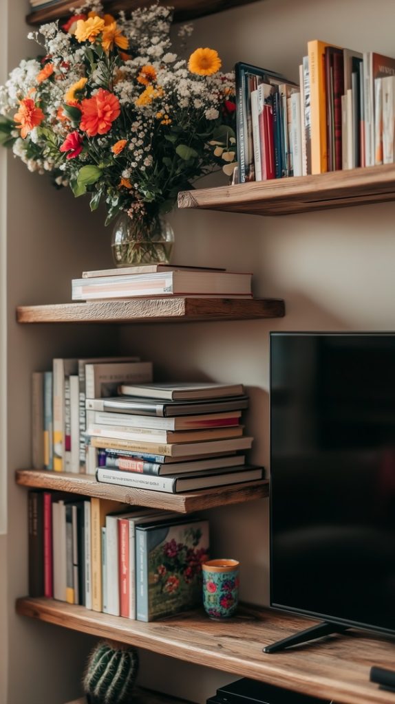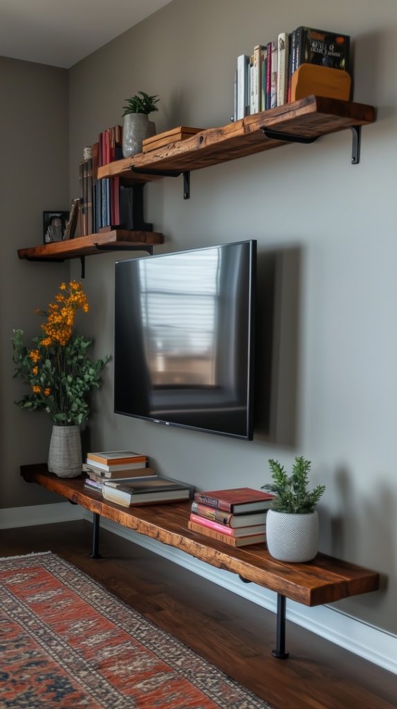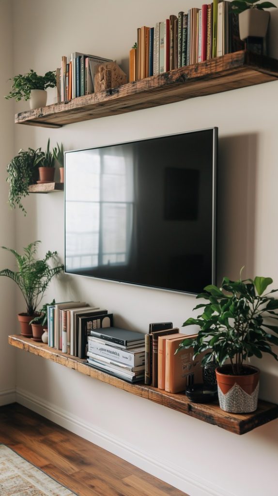 For a rustic yet modern twist, these floating shelves create a charming TV wall. The wooden shelves are mounted above and around the TV, offering space for books, plants, and other decorations. The rough texture of the wood adds warmth to the space, while the minimalist design keeps the room feeling open and airy. Perfect for small living rooms that need both storage and style.