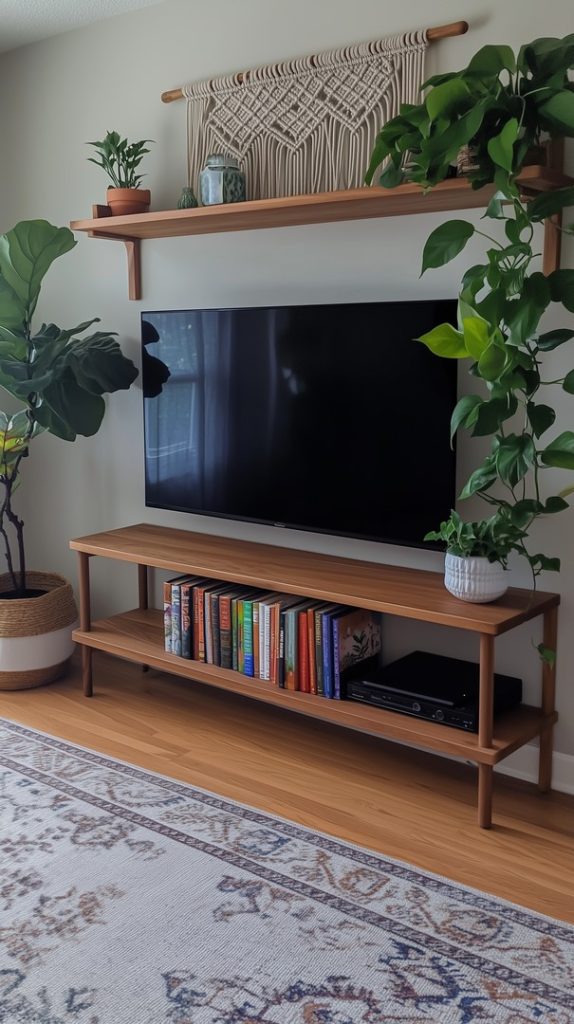 This rustic design features floating wooden shelves surrounding the TV, perfect for adding a touch of nature to the living room. The wooden shelves provide space for books and plants, while the mounted TV blends seamlessly into the organic aesthetic. This look is perfect for those who enjoy a more natural, cozy atmosphere.