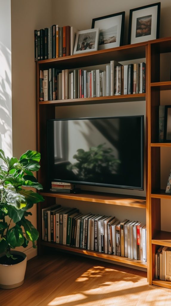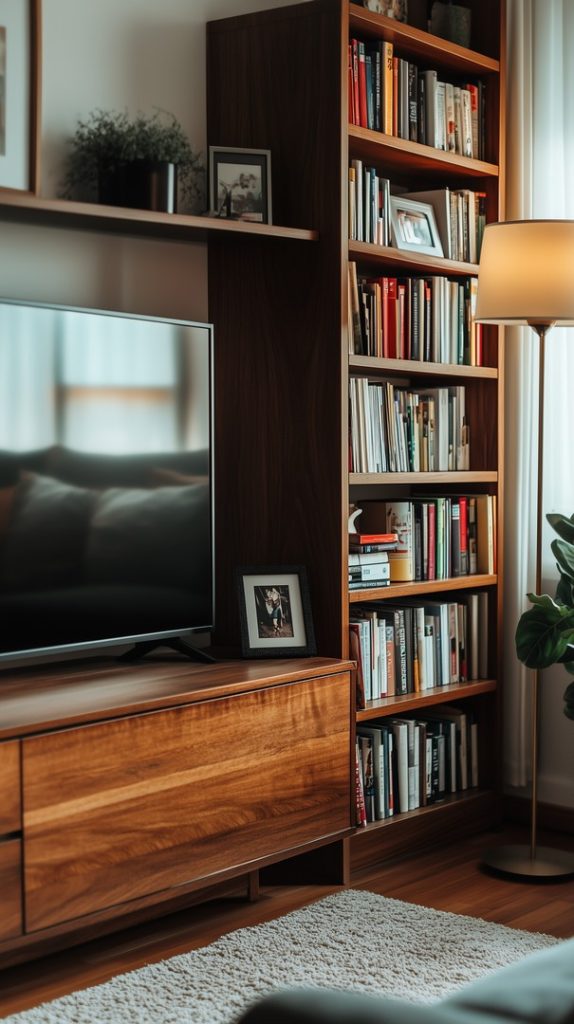This dark wood shelving unit adds a sense of warmth and coziness to the room. The TV is framed by open shelves that provide ample space for books, photos, and decorative items. The rich tones of the wood create a warm contrast with the lighter walls, making the space feel inviting and sophisticated.