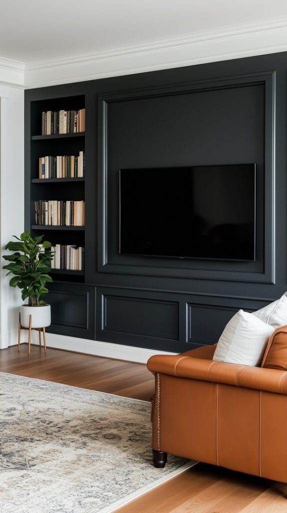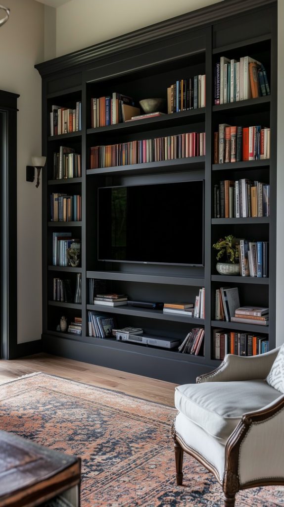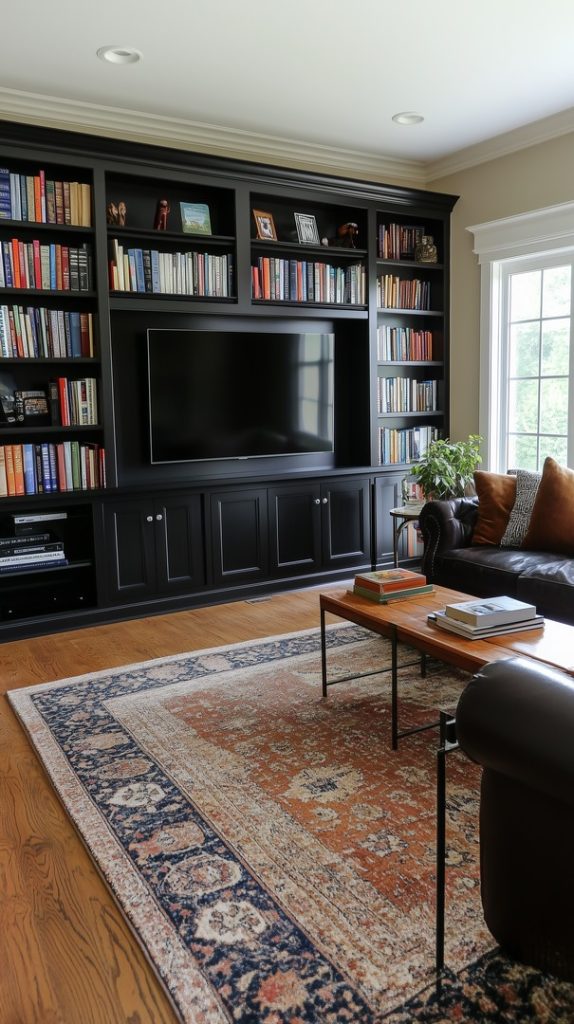 This bold, dark wood built-in TV wall is perfect for those who love a dramatic look. The black shelving frames the TV while providing ample space for books and decorative items. The contrast between the dark wood and lighter flooring creates a visually striking design that adds a luxurious feel to the living room.