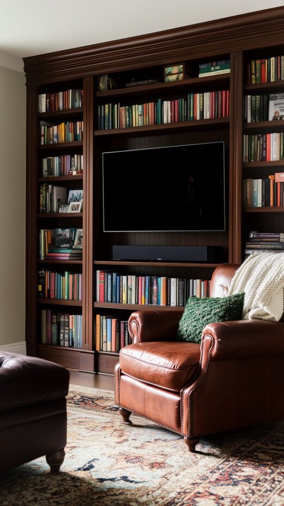 This dark built-in shelving unit perfectly frames the TV while providing a dramatic backdrop for the living room. The deep tones of the wood create a luxurious feel, while the open shelves offer space for books and decorative pieces. This design adds a rich, cozy atmosphere to any room, ideal for a sophisticated yet functional entertainment center.