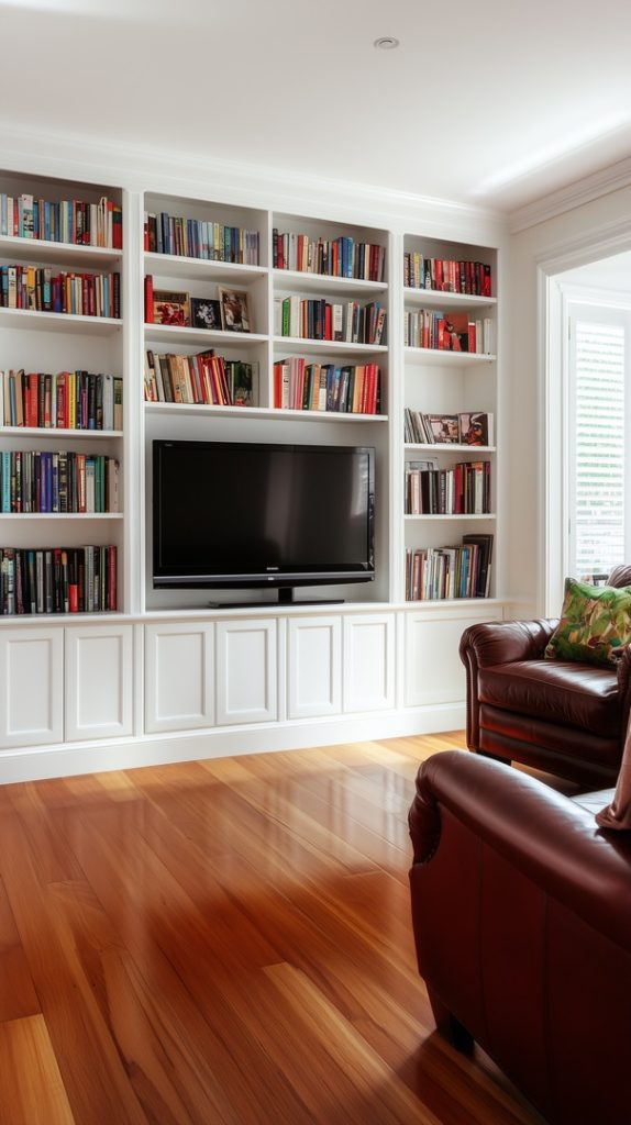 Create a timeless and elegant look with this white built-in bookshelf surrounding the TV. The clean, crisp lines of the white cabinetry offer a classic and sophisticated appeal, while the ample shelving provides practical storage for books, decor, and entertainment devices. This setup is ideal for those looking for a functional yet polished entertainment center.