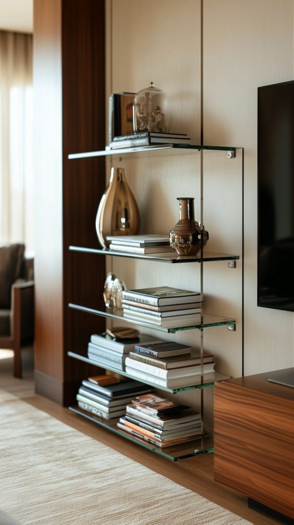 For a modern-industrial vibe, this glass TV shelving unit offers a sleek alternative to traditional wood. The metal accents and transparent shelves create a floating illusion, allowing decorative pieces and books to shine without taking away from the TV’s placement. This design is ideal for urban lofts or modern living spaces seeking a minimalist yet edgy aesthetic.
