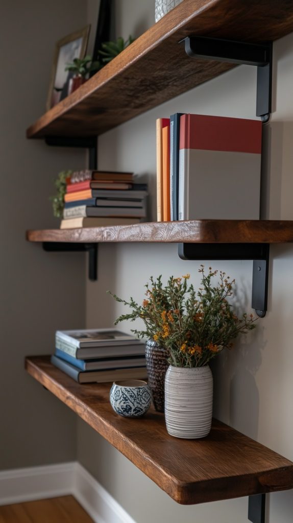 Enhance your living room’s natural charm with these floating wood shelves that frame the TV. The simple design allows the natural beauty of the wood to shine, adding warmth and texture to the space. The shelves offer just the right amount of storage for books, plants, and decor without overwhelming the room. A perfect option for those seeking a minimalist yet rustic vibe.