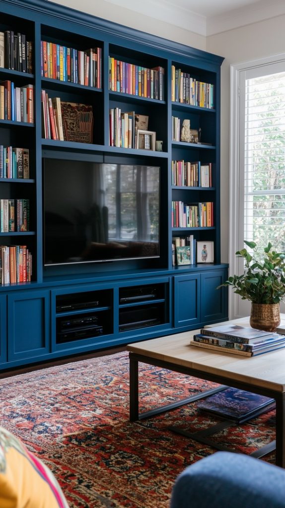 Make a statement with this bold blue bookshelf that frames the TV beautifully. The deep blue cabinetry adds a pop of color to the room while providing a stylish and organized space for books, decor, and media equipment. This design is perfect for those looking to infuse a bit of personality and color into their living room without overwhelming the space.