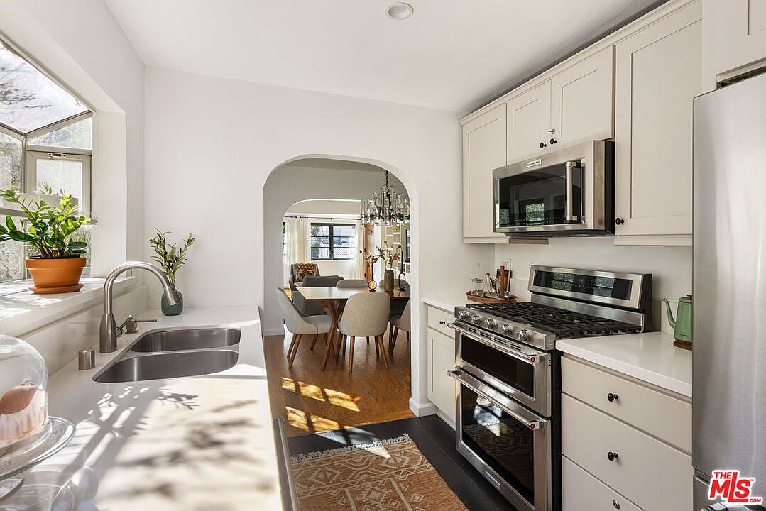 The kitchen features a bright and airy layout with soft white walls and clean cabinetry. A sleek stainless steel stove complements modern appliances nestled between elegant light cabinetry. The countertop is a smooth, light surface, enhancing the feeling of openness. Natural light streams through large windows, accentuating a small plant perched on the sill. The adjoining archway leads into a dining area, hinting at a cozy, inviting vibe with a wooden dining table and stylish chairs visible. Underfoot, warm hardwood flooring contrasts with a decorative rug, tying the space together with a harmonious blend of function and style.
