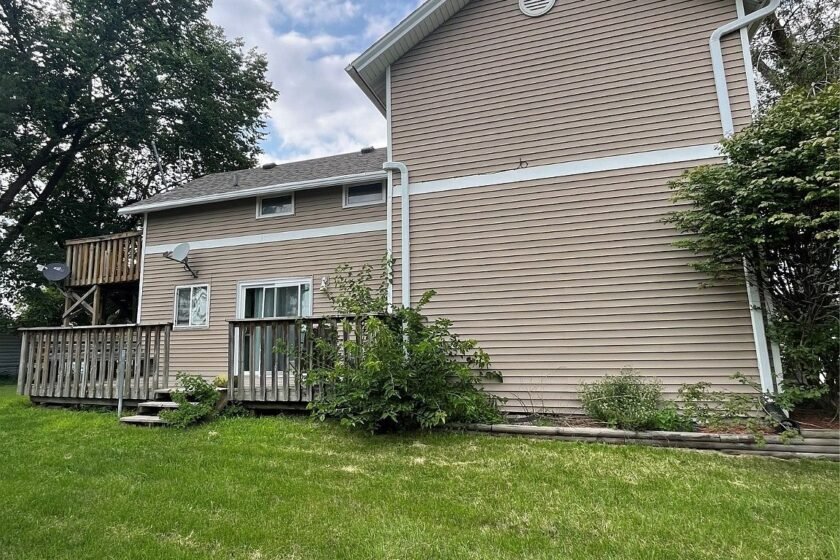 The side of the house presents beige horizontal siding with a contrasting white trim that runs along the midsection and around the eaves. A white door is set flush against the wall, leading inside. Two trash bins and an HVAC unit are placed near the house’s base, standing on a stone or concrete platform. The green grass lawn is well-maintained, bordered by a narrow garden bed with mulch and minimal landscaping. To the right, wooden stairs ascend to an elevated deck, constructed with natural wood in a simple, functional design, hinting at outdoor access to an upper level. Tall trees in the background offer shade.