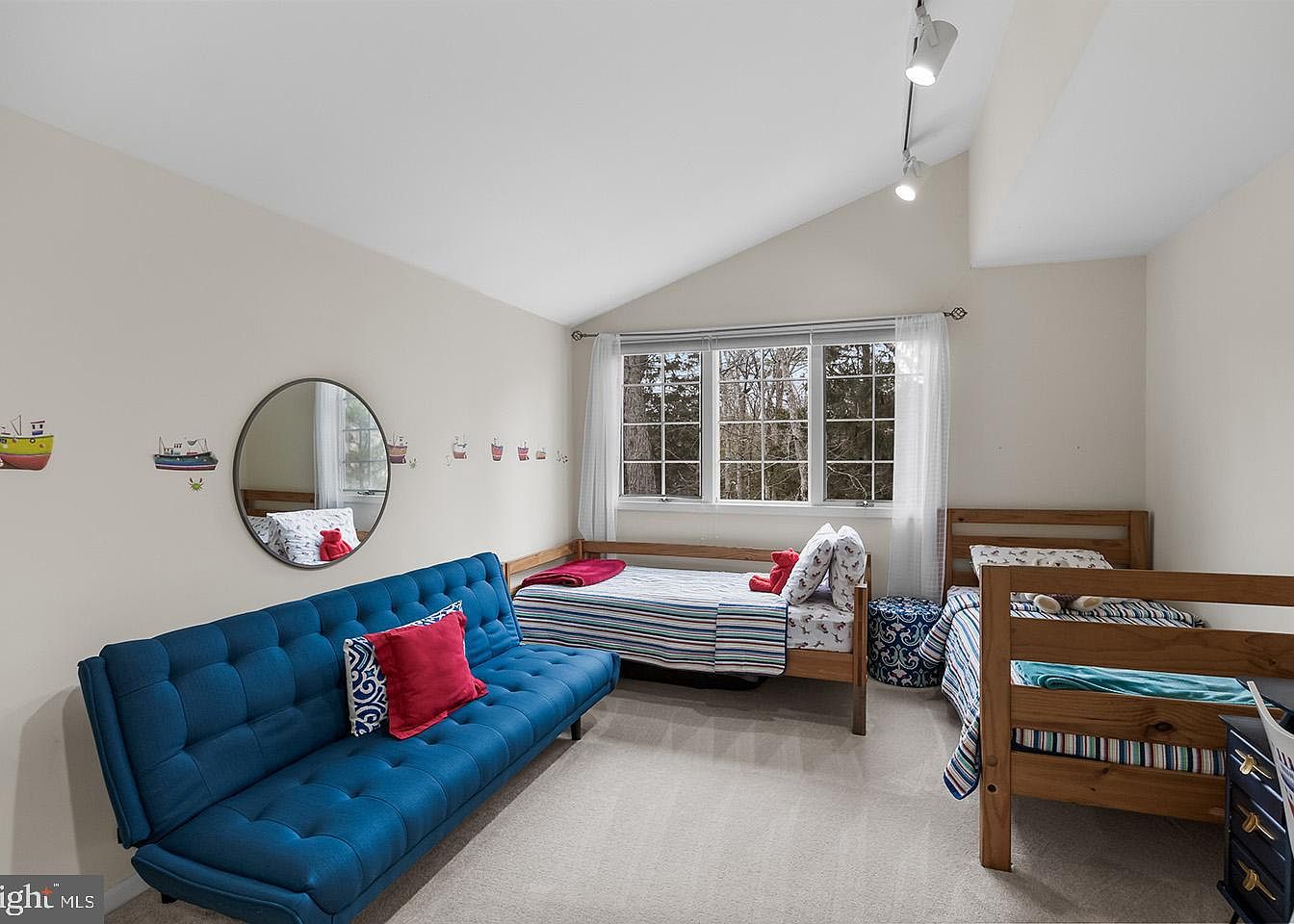 This cozy children’s bedroom features a vaulted ceiling that enhances its spaciousness, complemented by soft beige walls and neutral carpeting. Two wooden twin beds with striped bedding sit under a large triple window dressed with sheer white curtains, allowing natural light to flood the room. A vibrant blue futon sofa lines one wall, accented with patterned and solid red throw pillows, creating a playful contrast. Nautical-themed wall decals and a round mirror add charm, while track lighting overhead ensures ample illumination. The overall style is comfortable, colorful, and child-friendly, designed for both rest and play.