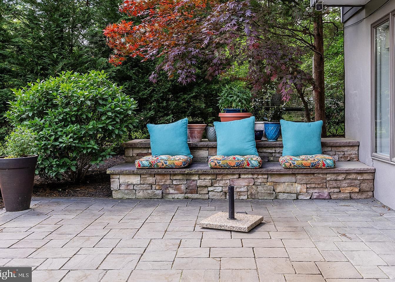 This outdoor patio area features a stone-built bench integrated into a low retaining wall, creating a cozy seating nook. The bench is topped with plush, turquoise cushions paired with colorful, patterned seat pads that add vibrant pops of color against the natural stone backdrop. Surrounding the seating is lush greenery, including dense shrubs and a Japanese maple with striking multicolored leaves, providing a mix of deep green, red, and purple hues. The stone tile flooring enhances the rustic, natural aesthetic while ensuring durability. Potted plants add texture and warmth, making the space inviting and well-designed for outdoor relaxation.