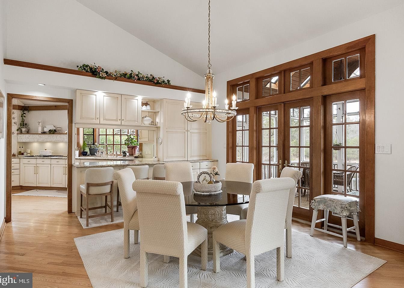 This dining area exudes a warm, inviting atmosphere with soft ivory tones and natural wood accents. A round glass-top table with an ornate stone base is surrounded by six cushioned chairs, upholstered in a textured off-white fabric, resting on a pale patterned area rug. Above, a delicate chandelier with candle-like lights emphasizes a classic, elegant touch. The dining space opens to a kitchen framed by white cabinetry and granite countertops, separated by a breakfast bar with high stools. Expansive wooden-framed French doors lead to an outdoor porch, allowing ample natural light and connecting indoor and outdoor living seamlessly.
